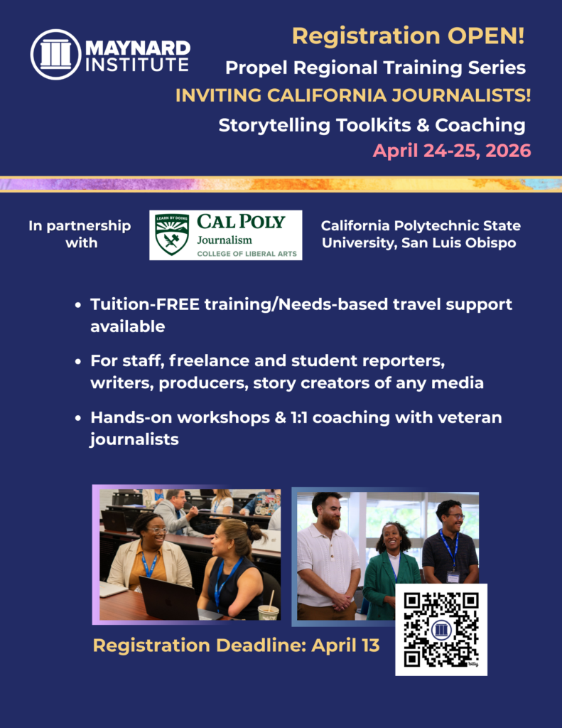 In 2026, as part of our California Propel Local News Initiative, the Maynard Institute is offering two California Regional Trainings: one at California Polytechnic State University in San Luis Obispo April 24-25 focused on storytelling, and a second at California State University at Northridge in October 2026 focused on editorial leadership and newsroom management.