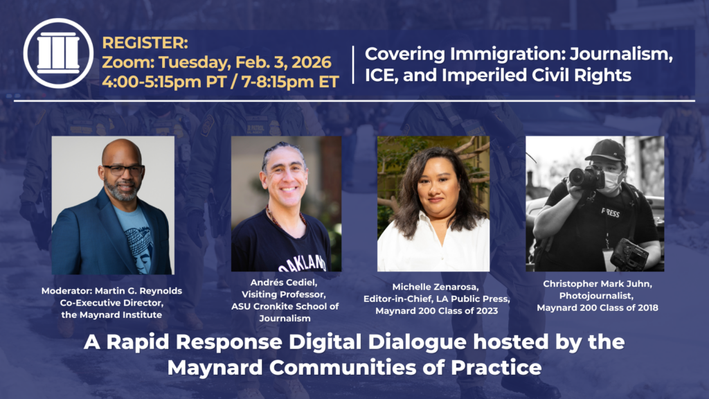 Moderated by Maynard Institute Co-Executive Director Martin G. Reynolds, this conversation will feature panelists Andrés Cediel, professor, UC Berkeley Graduate School of Journalism; Michelle Zenarosa, editor-in-chief at the LA Public Press and Maynard 200 alum; and Christopher Mark Juhn, photojournalist on the ground in Minneapolis and Maynard 200 alum.