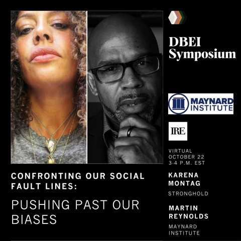 The first symposium on diversity and inclusion hosted by Investigative Reporters & Editors (IRE) virtually on October 21-22, 2021, included a session “Confronting our social Fault Lines: Pushing past our biases” on Friday, October 22nd from 3:00pm – 4:00pm ET, featuring the Maynard Institute’s Co-executive director Martin G. Reynolds and Stronghold’s Founder Karena H. Montag, MFT.