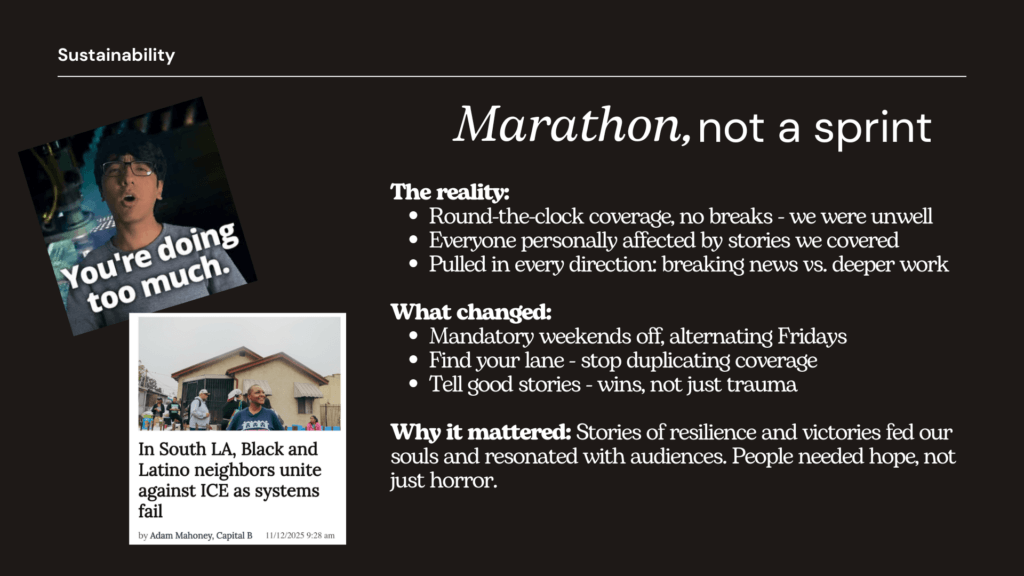 “The voices of our two Maynard alumni panelists on the frontlines in Minneapolis and Los Angeles exemplify the power of peer learning, collaboration and support. These are cornerstones of our Maynard Communities of Practice programming that serve our Institute graduates cohort, and we bring to the journalism field – vital in this moment of rupture.