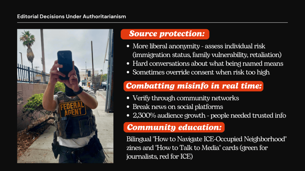 Together, panelists discussed the erosion of civil rights and the mandate of journalism as the “bulwark of our democracy,” as well as physical and digital safety for reporters, mental health and balancing obligation with burnout. Professor Andrés Cediel also discussed the legality of immigration laws from the Constitution to civil courts, and ramifications of civil rights violations for journalists and journalism.