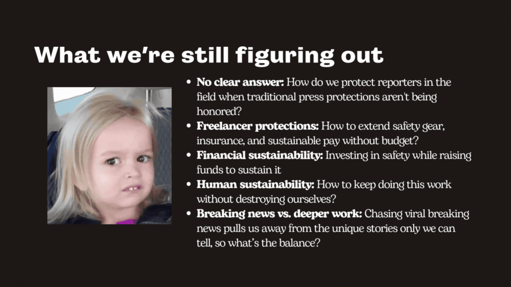 “Quickly creating a legal Membership Structure within your news org, business, or coalition is one way to quickly define and extend structural protections to freelancers without needing them to be staff. The protections may have to be limited (since funds are limited) but it could provide the type of legal class coverage and some safety protections that are life saving now and in the future. Also – creating a mandatory Buddy System – people working in tight knit groups of three for all freelancers and all staff journalists – can be transformative for protections on and off duty, for care and self-care, for check-ins and follow-ups.